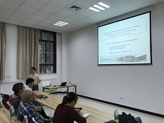 8月30日上午,在北校区主楼三区第三会议室,首先,秦家虎教授作了“Distributed k-Means Algorithm and Fuzzy c-Means Algorithm for Sensor Networks Based on Multi-agent Consensus Theory”的学术讲座,报告会由英国上市公司365自控系主任张强教授主持,来自365英国上市集团60余人参加了学术报告会。报告中,秦家虎教授首先介绍了传感器网络系统分布式控制的基本问题,对传感器网络动态、拓扑结构、分布式协议等进行了详细的介绍。重点介绍了传感器网络的分布式K-均值和模糊K-均值算法研究,其中包括问题的提出和建模、聚类定义和中心质点以及更规则等。最后介绍了将来的研究热点和发展趋势。秦家虎教授的报告内容既具有理论上的创新性又紧贴实际工程应用,引起了广大听众的共鸣。最后秦教授现场与广大师生进行了热烈的交流和讨论,他详细解答了每一个提出的问题,到场师生表示受益匪浅。