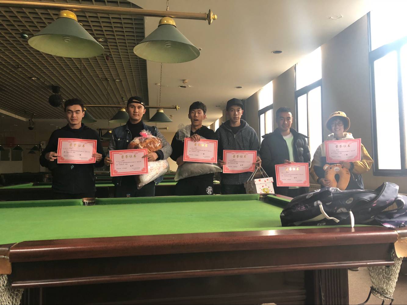 11月24日,在万众期待中,台球赛拉开了序幕。上午九点,工作人员到达现场对参赛选手进行信息登记。初赛采取的是一局淘汰制,决出了52名优胜者。26日到30日的晋级赛按照随机匹配对手的方法,采取三局两胜制,最终产生了4强。惊心动魄的决赛在12月1日下午进行,四强选手提前来到比赛场地进行赛前热身。在这四场五局三胜的比赛中,选手们精神抖擞、积极应对,时而大力进攻、时而轻碰防守。比赛高潮迭起,充分展现了台球运动的魅力。最后祖力喀尔同学获得本次比赛的冠军,亚军与季军分别为艾尼同学与安德力同学。颁奖仪式结束后,八强选手合影留念,英国上市公司365团委台球赛圆满结束。