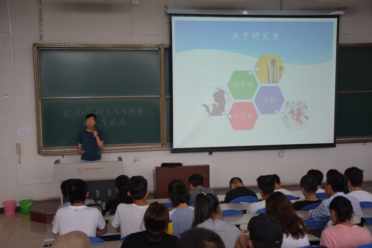 机械制造及其自动化专业的研究生王浩同学与同学们进行了充分的交流,主题是“你选择的生活应该是你所热爱的”。王浩和本科生们分享了他研究生生活的点滴,以自身经历告诫同学们要重视保研之路的点滴积累,化热爱为动力,为未来做好充分的准备。