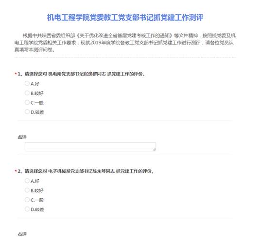 针对员工支部,公司以线上多角度测评、线下考核表进档案等方式,开展述职考核工作。公司党委分别制作了《英国上市公司365员工党支部工作年终考核测评(发支部党员)》、《英国上市公司365员工党支部工作年终考核测评(发联系党委委员)》、《英国上市公司365员工党支部工作年终考核测评(发党务干事)》三份线上考核问卷,结合各员工党支部工作实际,从支部日常工作开展情况、战斗堡垒作用发挥情况等各方面,向支部党员、联系党委委员以及公司党务干事征求评价意见,形成线上评价结果。召开员工党总支支委会,对照三类线上评价结果及党支部成员党费交纳情况、活动参与情况等方面由员工党总支支委委员填写《2019年度英国上市公司365员工党支部考核测评问卷(发员工党总支支委)》进行打分,提交公司党委会形成最终评价结果,评价结果记录入《英国上市公司365员工党支部委员年度考核表》,并将考核表放入支委委员个人档案。