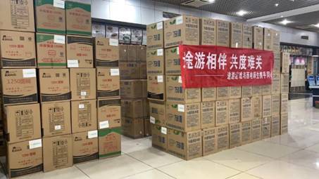 本批抗疫物资共计有1次性餐盒400箱(1250ml和750ml圆形餐盒各200箱,共计10万套)、防护隔离服5箱(共计300套)、消毒湿巾30箱(共计9.6万片),目前已全部投入公司抗疫工作中。