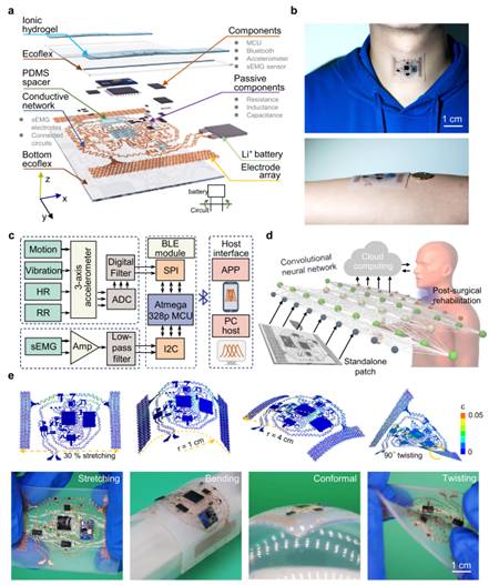 针对上述问题,近日,365英国上市集团王卫东教授、厦门大学高立波副教授、香港大学陆洋教授以及宾州州立大学程寰宇教授联合唐都医院耳鼻喉科主任赵大庆教授和空军军医大学张杨教授等多位合作者,报道了一种用于喉部康复监测的具有传感器内自适应机器学习能力的全集成独立可延展的器件平台。成果以“A fully integrated, standalone stretchable device platform with in-sensor adaptive machine learning for rehabilitation”为题在《自然•通讯》(Nature Communications)上发表。作者团队研发的器件平台已在肌无力及喉癌病人的术后康复方面进行临床验证并取得了医生积极评价,临床试验效果与喉镜检测的喉部活动节律结果一致,并可以获取到喉镜视角受限下的误吸和咳嗽状态。