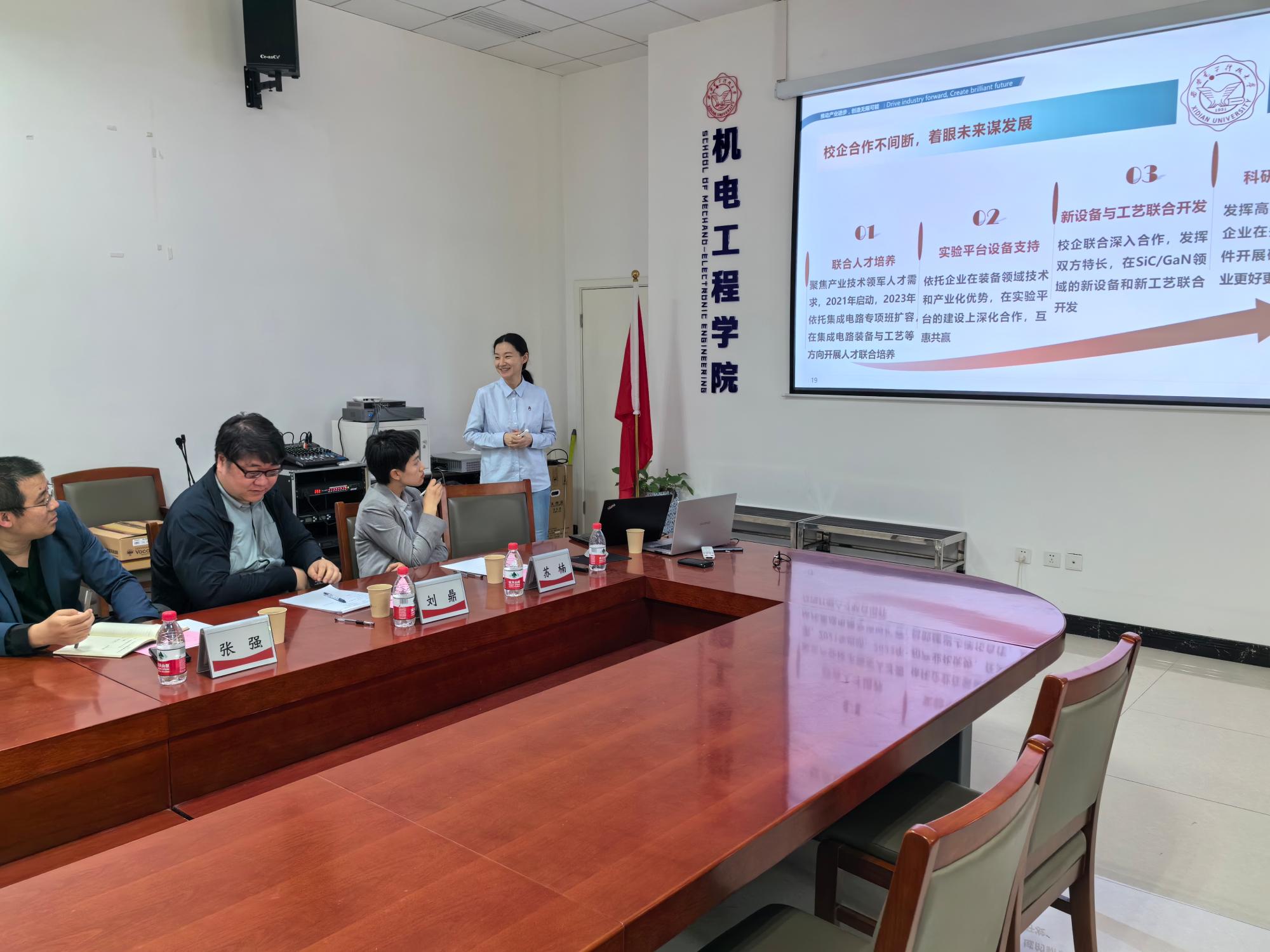 随后,谢谦对公司的热情接待表示感谢,并详细介绍了北方华创的公司概况、与西电的合作历程以及当前校企联合培养的状况。她提到,当前集成电路行业面临人才短缺、培养周期长和内部竞争激烈的挑战,因此希望通过校企合作整合双方资源,推动前沿科技成果的工程转化和研发人才的前置培养,实现公司、企业、教师和员工四方共赢。为此,北方华创已推行“梧桐计划”,初步构建了一套人才培养体系,并邀请对化合物半导体装备有兴趣的公司教师加强技术交流,共同培养更多适应产业发展需求的综合性人才。