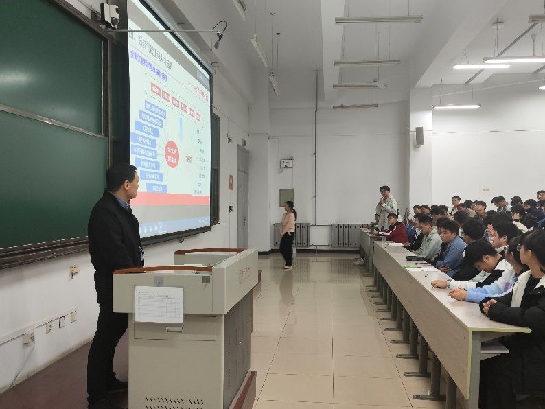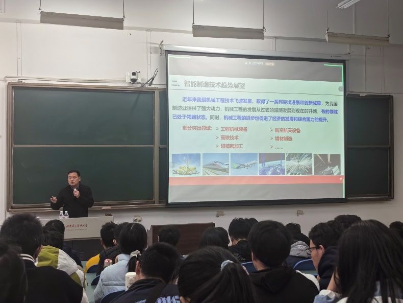 訾斌从公司概况讲起,为同学们介绍了公司丰硕的科研成果、强大的团队平台和高质量人才培养成效,加强了员工对公司和专业的认同感。他表示,以机械工程为基础的实体制造业,已经成为国家经济的命脉,党的十八大以来,习近平总书记多次强调发展制造业的重要性。他针对智能制造系统架构和六项关键技术做了详细的讲解,让同学们建立起对智能制造技术方向的初步认知。紧接着,他从高端装备与核心技术、智能工业机器人、增材制造技术、智能车辆、智能机床、国防军工装备智能制造六个方向,介绍了智能制造技术发展趋势展望。訾斌强调,智能制造工程教育以国家战略需求为导向,培养综合素质全面发展的全方位人才。他鼓励同学们从大一起就要积极参与广泛的科研、竞赛及课外活动,同时培养专业能力与非专业能力。